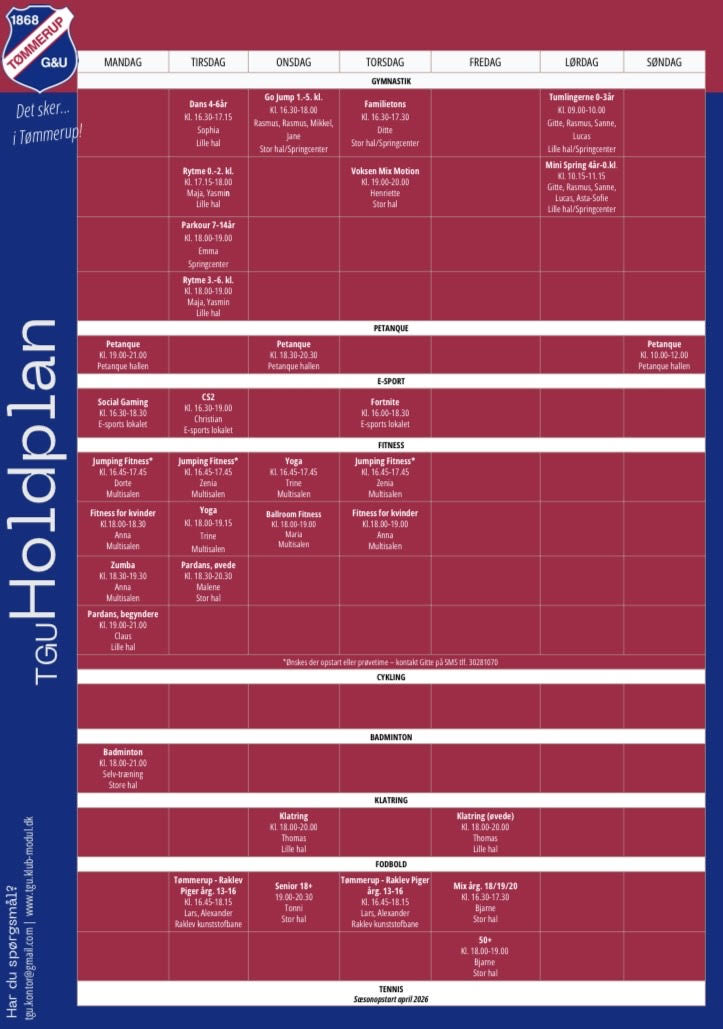 TGU – Tømmerup Gymnastik- og Ungdomsforening – med over 150 år erfaring med aktiviteter, men er stadig fuld af liv, energi og fællesskab! Med omkring 700 medlemmer og stærk lokal opbakning er vi et aktivt samlingspunkt for både børn, unge og voksne i området øst for Kalundborg.